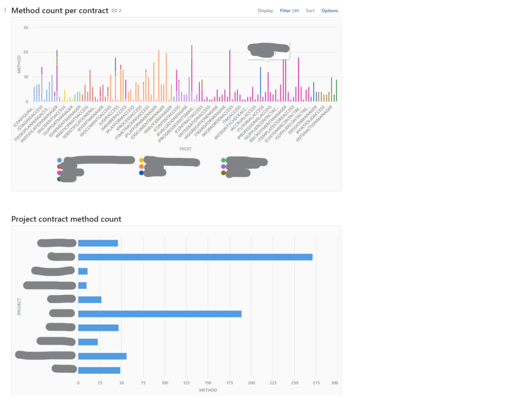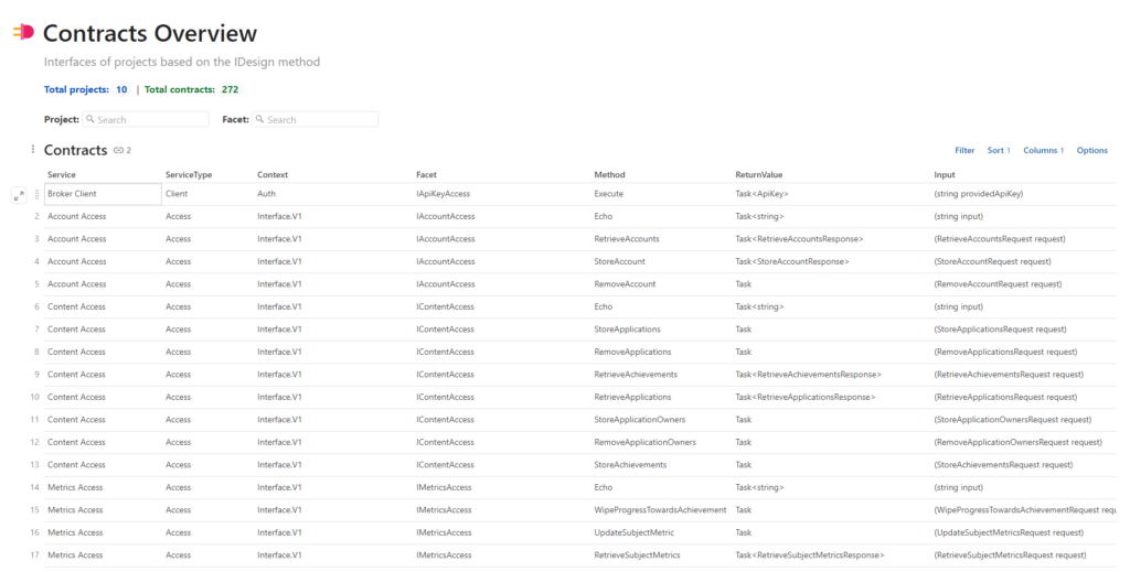 We gathered all methods on all contracts and captured the following information: service name, service type, context (although it is not used very often), facet, method, return value, input, the architect, year of the projects (these last two are omitted from the screenshot)